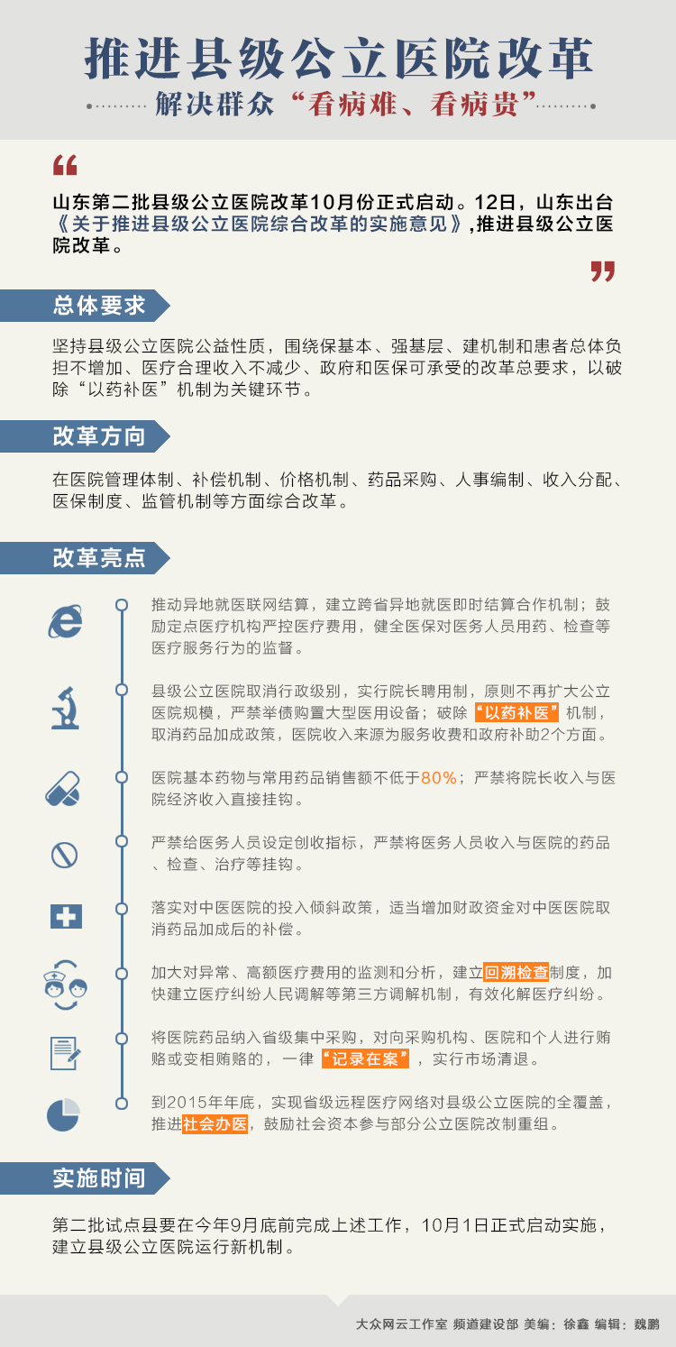 大众网济南8月13日讯(记者李兆辉)山东第二批县级公立医院改革10月份正式启动。12日,山东省政府出台《关于推进县级公立医院综合改革的实施意见》。大众网记者了解到,此次公立医院改革深入到社会关注的8个方面,包括管理体制、补偿机制、价格机制、药品采购等,以破除“以药补医”机制为关键环节,确保患者总体负担不增加、医疗合理收入不减少、政府和医保可承受,最终建立起一种县级公立医院运行新机制。