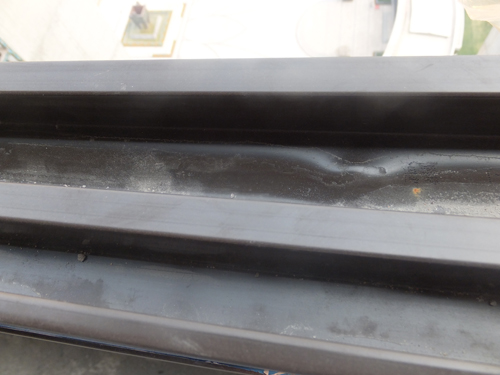 本以为经过上次“色差”事件后一切都会顺利,不曾想2014年7月21、22、23日,连续3天我县持续出现40°左右高温天气,同时连续两天下午还下了阵雨。24日下午下班后,安装工人汇报说发现部分窗框出现变形,推拉框上口变窄,因当时天色已晚,我们从多年的经验分析不会有大的问题,也许是个别现象,就没有特别重视。25日一早上班,到工地查看才大感意外,推拉框下部槽内凹陷严重,上口变窄,逐一排查,遂发现问题严重,几乎所有东、南、西面阳台、飘窗推拉窗部分下部均有类似现象,原本宽度应为88mm的推拉框,上口均有收缩,基本达到75——85mm,与此同时,甲方巡视的技术人员也发现了该质量问题,同时还发现部分固定框下部也出现鼓包、凹陷现象。经双方沟通,汇报上级主管领导,当即下达了停工通知,停止车间一切制作和工地安装,通知销售商到现场查明原因。