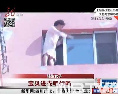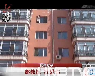(女子站6楼窗台要跳楼。(视频截图))
