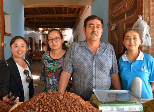沙拉木大叔热情招呼记者与自己和两个女儿在葡萄干摊位前合影。(摄影 李俊礼)