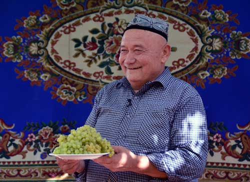 尼亚孜大叔捧出自家栽种的葡萄招待远道而来的记者。(摄影 李俊礼)