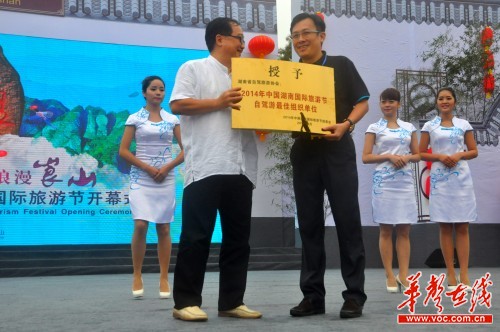 9月16日上午,省第十一届人大常委会副主任肖雅瑜向湖南省自驾旅游协会会长杨国林授牌“2014年中国湖南国际旅游节自驾游最佳组织单位”。记者 赖泳源 摄