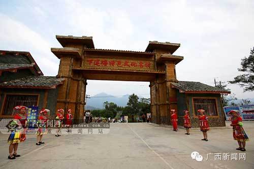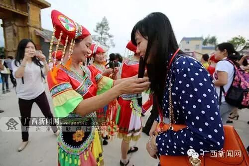 身着壮族传统服饰的群众代表给来访的记者们戴上绣球。