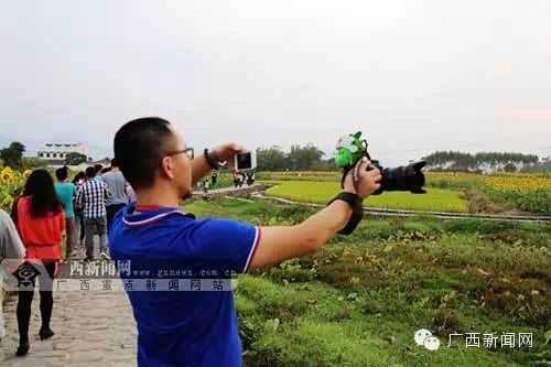 采访团记者面对金色花海,十分兴奋。祭出自拍“神器”。