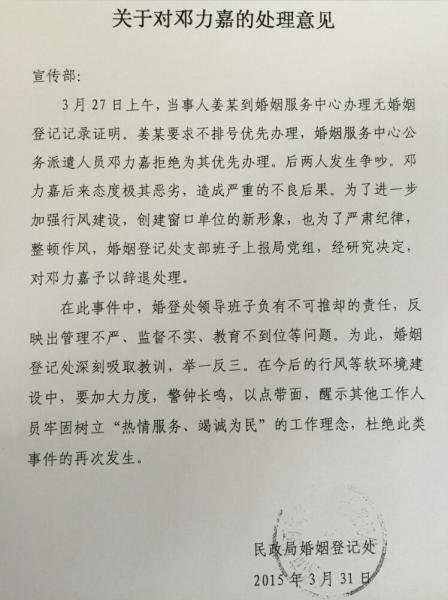 了解情况后,记者将情况反映至铁西区民政局。3月31日,铁西区民政局向本网民生频道回函称,为了严肃纪律,整顿作风,婚姻登记处支部班子上报党组,研究决定,对该名工作人员予以辞退处理。